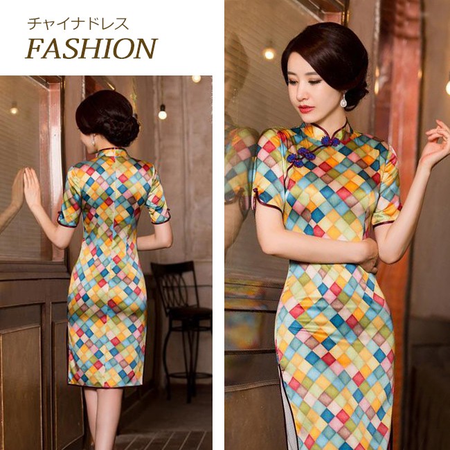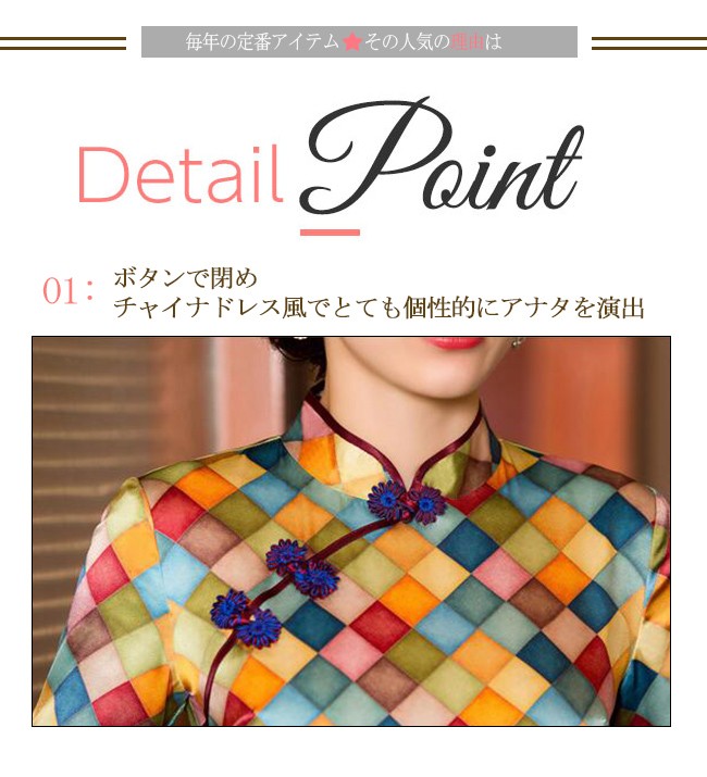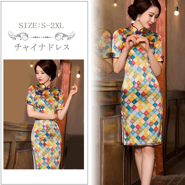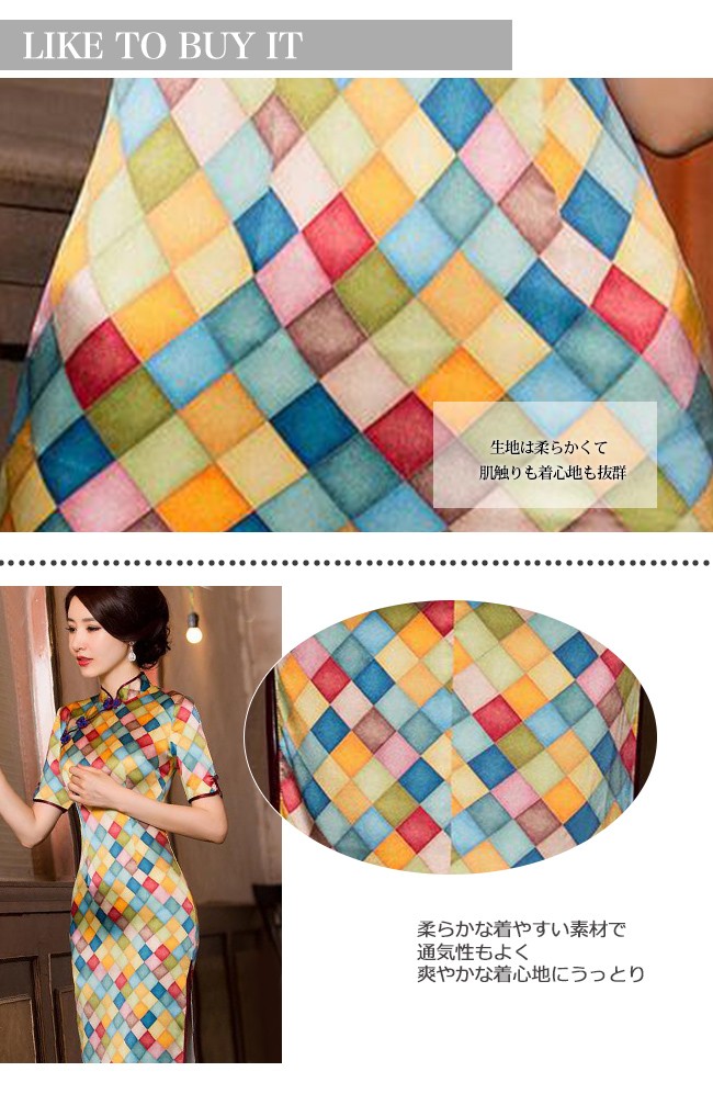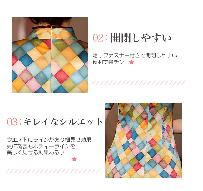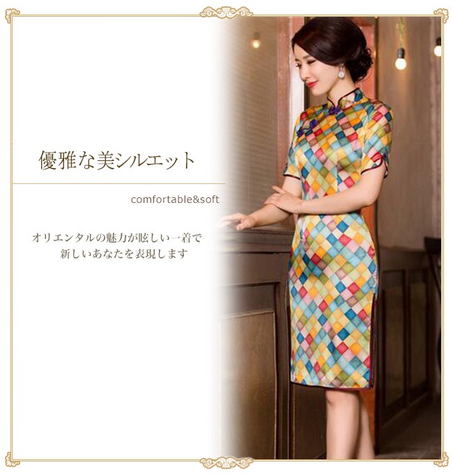 【商品説明】異国情緒溢れるチャイナドレスで注目をゲットしちゃいましょう♪ボディラインを綺麗にカバーしてくれる程よい加減もポイント♪一気に女子度があがる気がする♪軽くて柔らかい生地は肌にやさしくて、爽やかな着心地にうっとり♪※サイズ表記は目安です。誤差はご了承ください。※生産の関係により写真と色、柄が若干異なる場合があります。※商品は縫製上の細かいほつれ、インク飛び、織りむら、汚れ、新品臭いがある場合がございますので、気になるお客様はご購入をお控え下さい。素材:シルク95%+ポリエステル5%