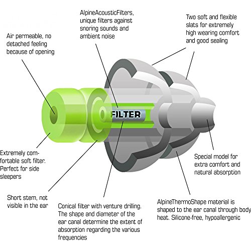 -. Feature : Protects up to 31 dB, absorbs ambient noise and snoring sounds / Extremely comfortable and soft due to soft AlpineThermoShape material, especially designed for (side) sleepers / Doorbell, alarm, and alarm clock can still be heard due to unique AlpineAcousticFilters / Alpine Cleaner included for easy cleaning / Can be worn all night and prove to give a better sleep