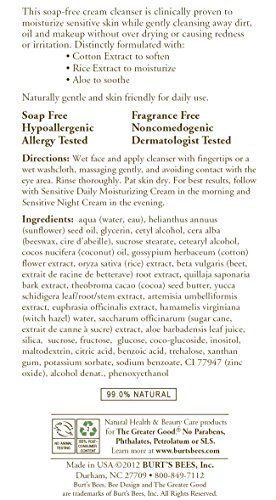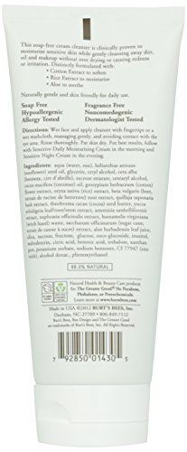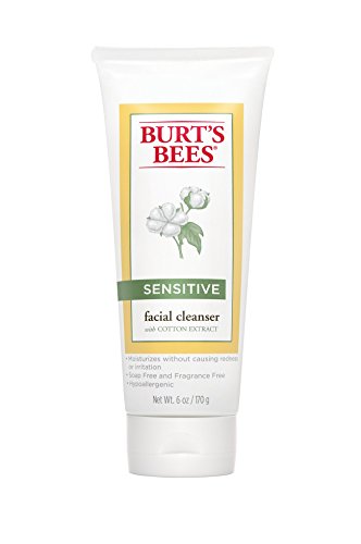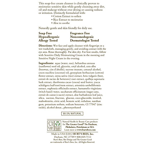 ReleaseDate : 2011-06-20 Studio : Burt's Bees Publisher : Burt's Bees Binding : Health and Beauty Product Description Moisturize sensitive skin as you cleanse with Burt's Bees Sensitive Facial Cleanser, clinically shown to wash away dirt, oil and makeup without causing redness or irritation. This soap free cream cleanser uses natural ingredients like cotton extract to soften the skin, as well as rice extract and aloe to moisturize and soothe. Gentle enough for daily use, this sensitive skin cleanser will leave you with a healthy looking complexion. It is a naturally gentle way to keep even very sensitive skin feeling clean and moisturized. 0