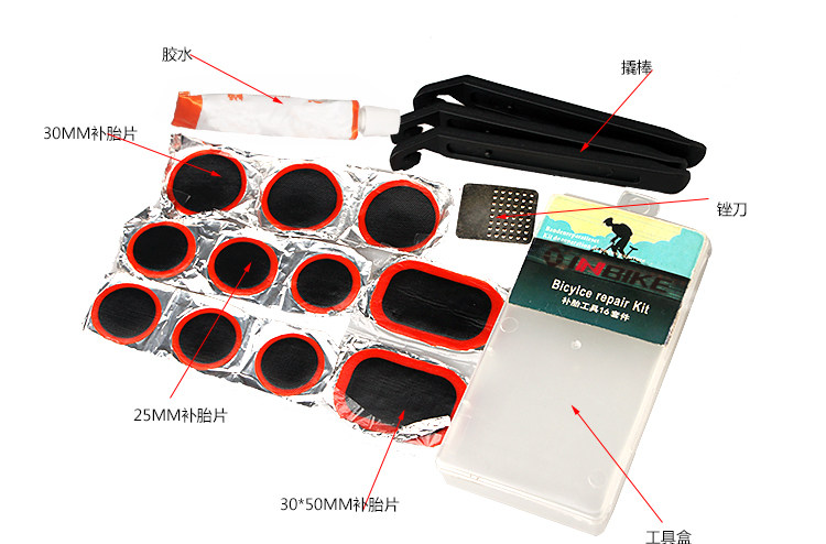 1. The multi-purpose bicycle repair tools: 2mm / 2.5mm / 3mm / 4mm / 5mm / 6mm Allen wrench each one; 8mm / 9mm / 10mm socket wrench each one; "word" / "cross" each a screwdriver ; 8mm / 10mm / 15mm hex wrench, one each