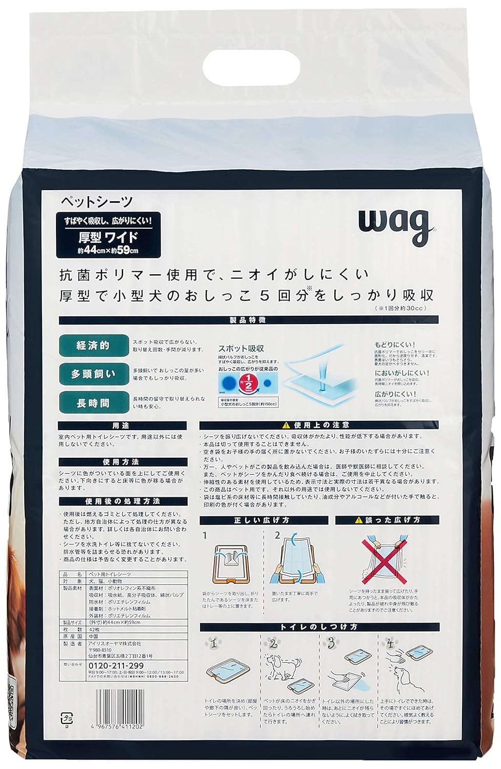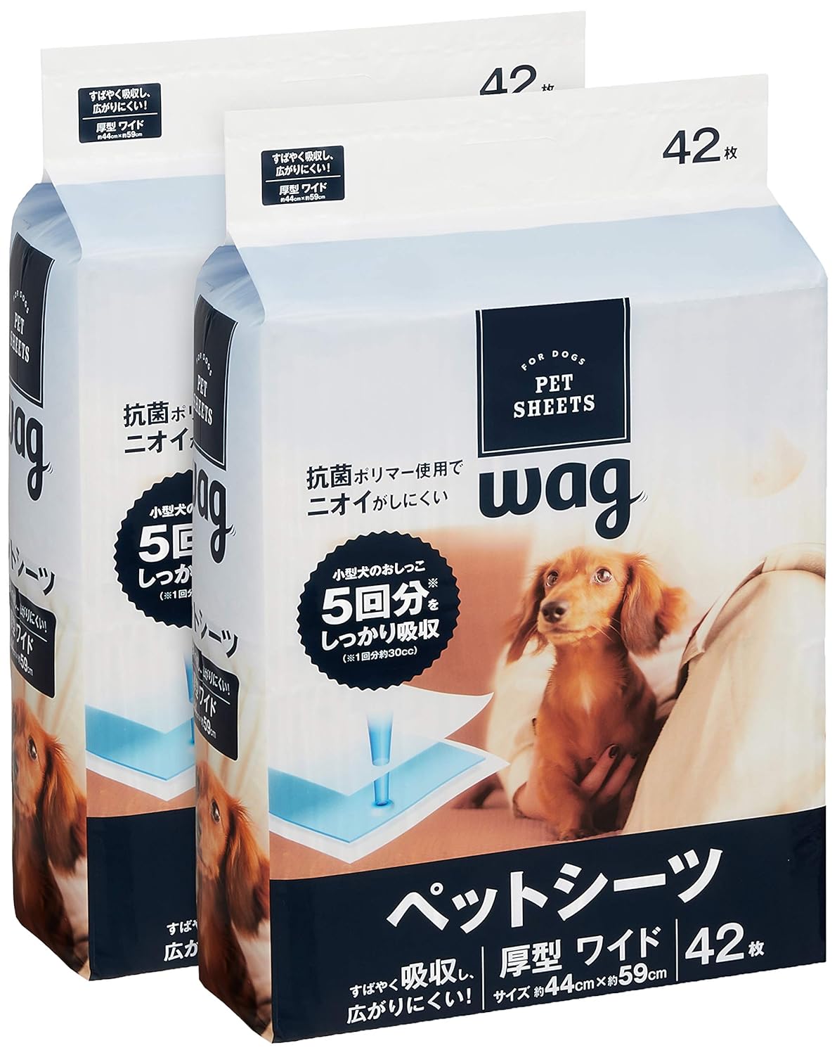 厚型 ワイド 42枚x2袋(84枚) 小型犬のおしっこ5回分を吸収(※小型犬のおしっこ1回分約30cc) 原産国:中国 サイズ (1枚あたり 幅X奥行) :44×59cm 重量(1枚あたり):約54.5g サイズ(1袋あたり:幅X奥行X高さ):30×14.5×39cm 重量(1袋あたり):2.48kg
