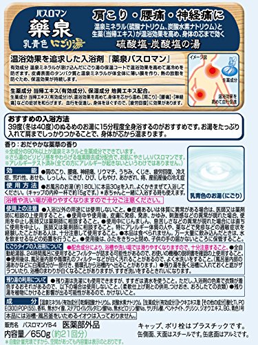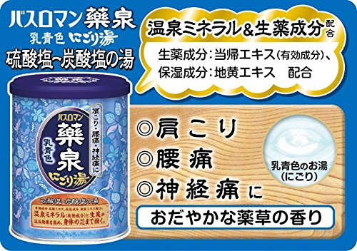 -. Binding : Health and Beauty -. Brand : BATHROMAN -. EAN : 4901080557315 -. Feature : Compounded with hot sP.R.Ing mineral like " dried sodium sulfate" (salt cake) and "sodium bicarbonate" (bicarbonate) (active ingredients). Herbal medicine component Ligusticum acutilobum (active ingredients) improves warm bathing effect warming the body to the marrow and relieves symp like stiff shoulders, lower back pain and nerve pain. / It also improves circulation and ease tension, so promote the recovery from fatigue. Compounded with moisturizing ingredient, Extract of Rhemannia. / With gentle fragrance of herbal medicine. / The color of water is Milky Blue (muddy) -. Label : Earth Chemical -. Manufacturer : Earth Chemical -. MPN : - -. PackageQuantity : 1 -. PartNumber : - -. ProductGroup : Health and Beauty -. ProductTypeName : HEALTH_PERSONAL_CARE -. Publisher : Earth Chemical -. Studio : Earth Chemical -. Title : Bath Roman Yakusen Japanese Bath Salts (Muddy Blue) 650g - 2015
