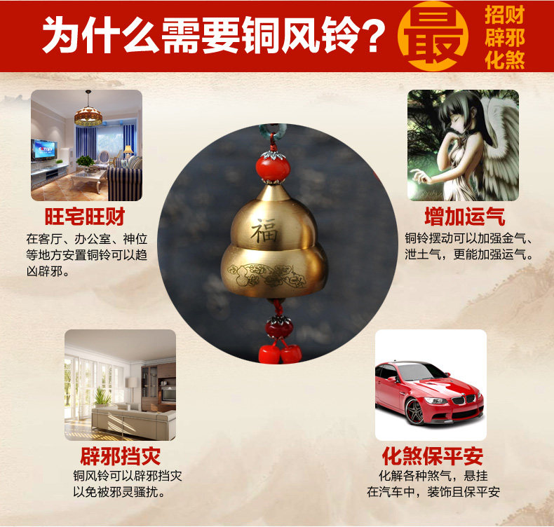 开光纯铜风铃/化五黄煞气风水镇宅挂饰辟邪保平安