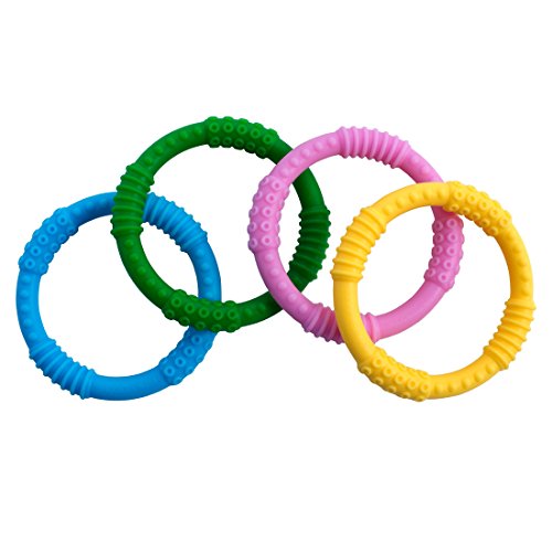 The Babynow 4 Pack Teether Rings are the perfect solution to help you and your baby get through the teething stage. The teether rings are small enough for little hands to grip, but large enough to eliminate the risk of swallowing and choking. The premium ridged design allows your baby to gnaw and bite at the sensory ring to soothe their aching gums while keeping them clean and healthy. The value pack comes in four beautiful, bright colors designed to stimulate your baby's senses and keep them interested in the toy.