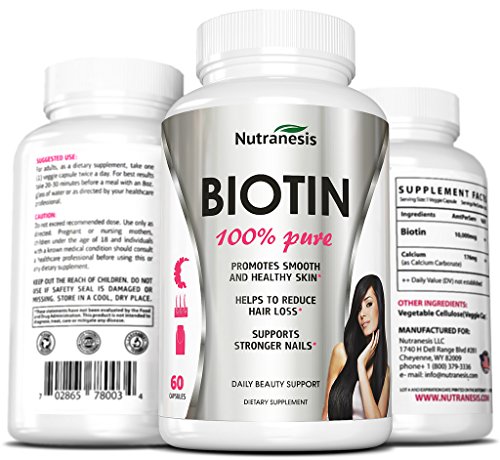 -. Binding : Health and Beauty -. Brand : Nutranesis -. EAN : 0702865780034 -. Feature : Best Biotin for Hair Growth, Nail Strength and Healthier Skin. / Complete Biotin Formula 10.000mcg. Fantastic Hair Care Formula. / 100% Pure Biotin for Hair, Skin and Nails. No Fillers / Made in USA. GMP Approved. 60 Vegetarian Biotin Pills / Results or Your Money Back. 100% Risk Free. Buy Yours Now and Thank Yourself Later! -. IsAdultProduct : 0 -. Label : Nutranesis INC -. LegalDisclaimer : *These statements have not been evaluated by the Food and Drug Administration. This product is not intended to diagnose, treat, cure or prevent any disease. -. Manufacturer : Nutranesis INC -. MPN : Biotin -. PackageQuantity : 1 -. PartNumber : Biotin -. ProductGroup : Health and Beauty -. ProductTypeName : HEALTH_PERSONAL_CARE -. Publisher : Nutranesis INC -. Studio : Nutranesis INC -. Title : Biotin Supplement with 10.000 mcg! For Hair, Skin and Nails - All Natural Formula - No Fillers - Easy to Swallow - 60 Vegetarian Capsules - Order Risk Free! -. UPC : 702865780034