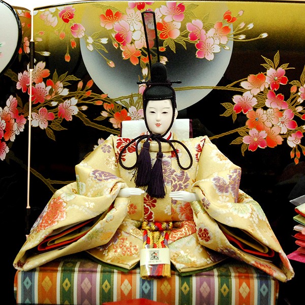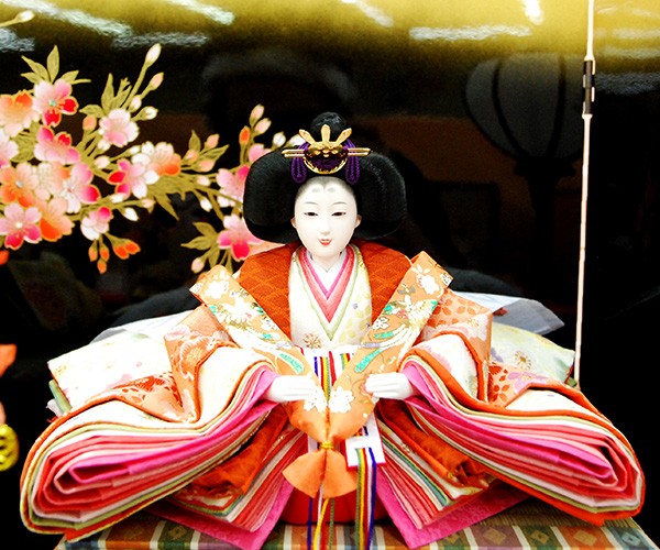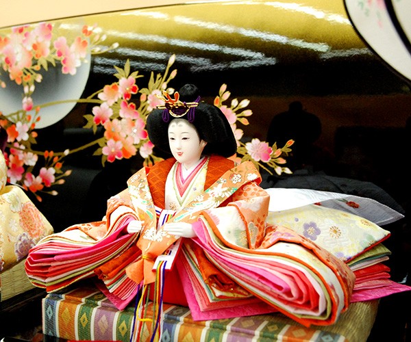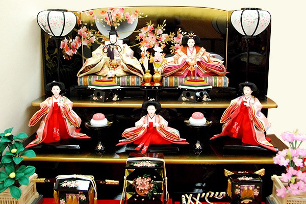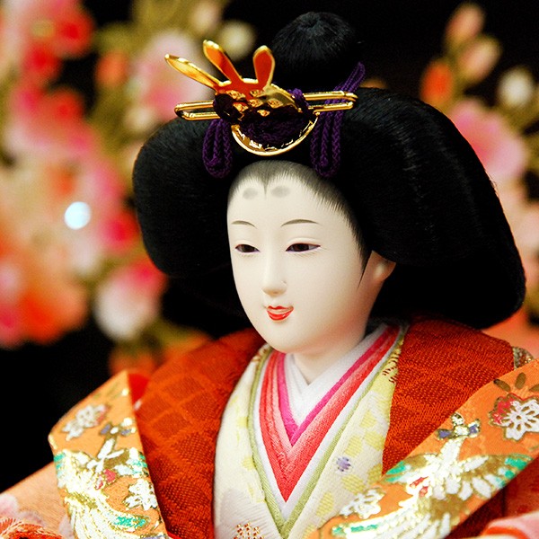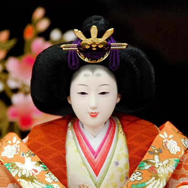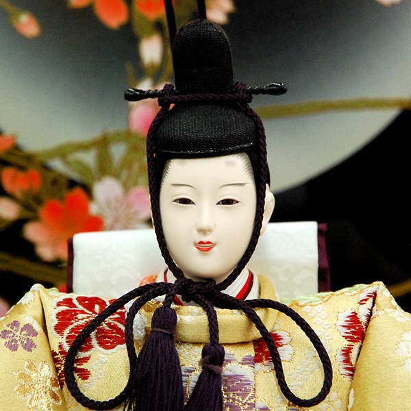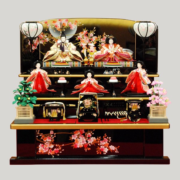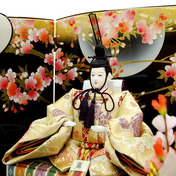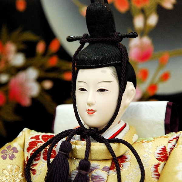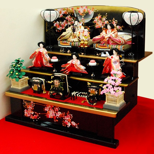 豪華な塗組立段に、優しくほほえんだ表情の内裏雛セット。黒塗り台鮮やかな花柄を描きました。 ・和洋室に合う高級自然木使用の台座の雛人形飾り