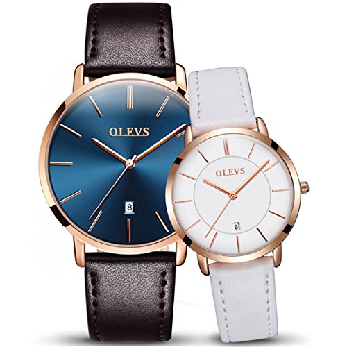 -. Title : OLEVS 2pcs Couple Quartz Automatic Waterproof UltraThin Genuine Leather Band Wristwatches Set for His and Her, Valentines Gift