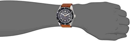 Brown leather strap with buckle closure; battery is recharged by solar panel built in dial; functional up to four months when fully charged by any type of light
