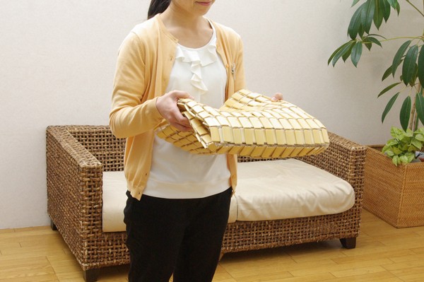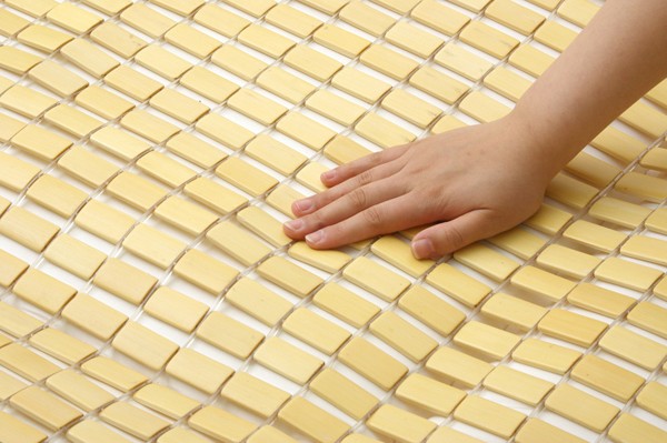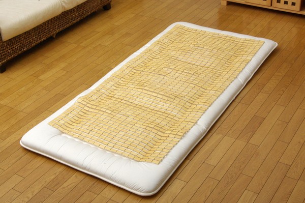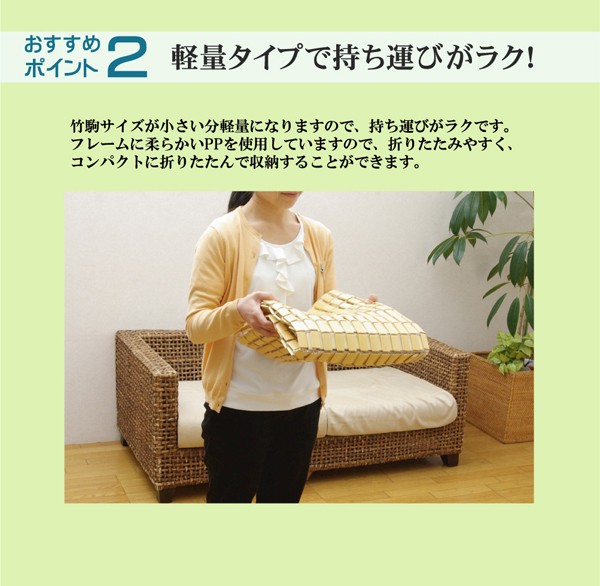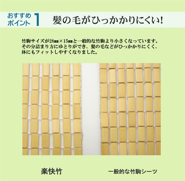 一般的な竹駒シーツよりも軽量化させました。竹駒と竹駒の間を約9mmあけ女性にもやさしい重量にしました。素材は麻雀竹の産地である福建省で育った天然の竹を使用しています。猛宗竹のひんやり感のある表面部分を使用しています。竹の表皮は、熱を吸収する機能に優れています。竹の持つこの特長が、ひんやりとした肌さわりをもたらします。綿素材と比較して体感温度が下がり、寝苦しいよるを快適にサポートしてくれます。マットレスなどの上に敷いてもぴったりとフィットして竹の硬さを感じません。竹の表面に天然青森ヒバ加工を施しています。(抗菌、防臭効果)青森県のヒバの木から抽出した「ヒバ油」を現地に送り、メーカー独自の技術で材料や商品に加工しました。「ヒバ油」には、ヒノキチオールという天然物質としては極めて抗菌性の高い成分が含まれ、医療や食品など多分野で利用研究が進められています。