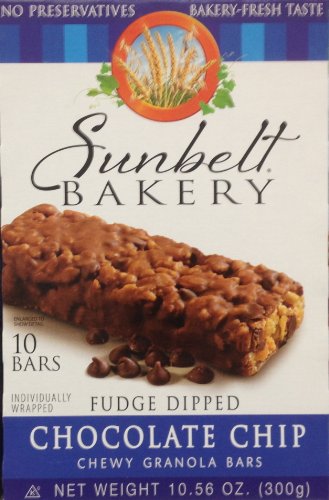 -. Feature : 3 Boxes of 10-Count Fudge-Dipped CHOCOLATE CHIP Chewy Granola Bars by Sunbelt Bakery / Individually Wrapped Bars. / Chocolate lovers rejoice! We've added the taste of fudge to our already delicious Chocolate Chip Granola Bar. / No preservatives. Wholesome energy source. Provides 5g of whole grain per serving.