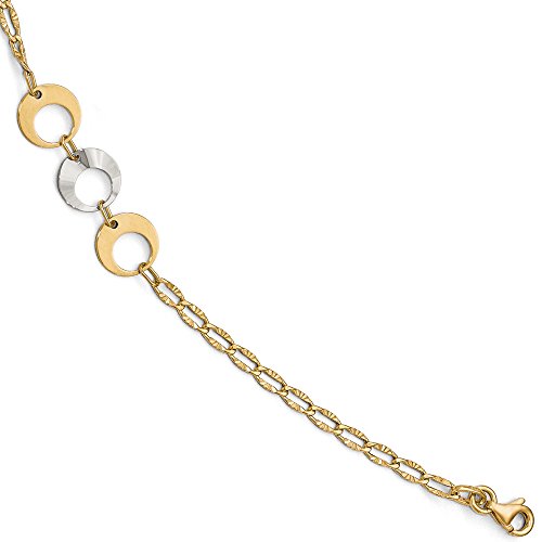 -. Binding : Jewelry -. Brand : The Black Bow -. Color : Yellow -. Department : womens -. Feature : Two tone 14k yellow and white gold / Approximate width 9mm / Adjustable 10 to 11 inch length / Average item weight is 2.66 grams / Includes our custom gift box -. Label : The Black Bow -. Manufacturer : The Black Bow -. Model : A8680 -. MPN : A8680 -. NumberOfItems : 1 -. PackageQuantity : 1 -. PartNumber : A8680 -. ProductGroup : Jewelry -. ProductTypeName : FINENECKLACEBRACELETANKLET -. Publisher : The Black Bow -. Studio : The Black Bow -. Title : 14K Two Tone Gold Triple Circle Link Station Anklet, 10-11 Inch