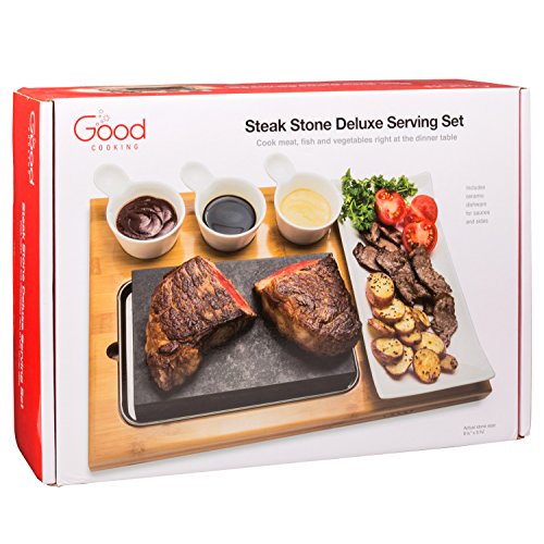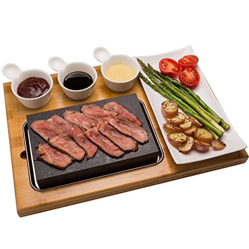 Cooking Stone- Lava Hot Steak Stone Plate and Cold Lava Rock Hibachi Grilling Stone w Ceramic Side Dishes and Bamboo Platter