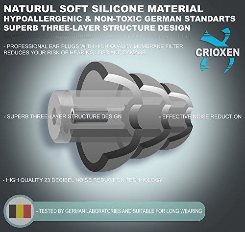 - 2 DIFFERENT EARPLUGS: PP3 SNR 23dB - Music, Concerts, Clubs, Parties, DJ’s Certificates: CE EN352-2 & ANSI PP2 SNR 25 dB - Travel, Sports, Racing, Swimming, Construction, Yard Work, Shooting. Airplane Certificates: CE EN352-2 & ANSI