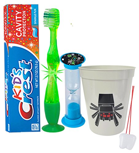-. Feature : Turn something your kids have to do into something they want to do...Because when brushing is fun, it gets done! / (1) Firefly Youth Flashing Lights Suction Cup Toothbrush (Assorted Colors) (1) Kids Crest Cavity Protection Sparkle Fun Toothpaste, 2.7 oz / (1) Minecraft Pixal Spider Themed 16oz Plastic Mouthwash Rinse Cup, Doubles As Toothbrush Holder! / (1) Dentist Recommended 2 Minute Minecraft Themed Brushing Timer (Assorted Styles) / Plus Bonus "Remember to Brush" Visual Aid Tooth Saver Necklace. Hang it in their bathroom or by their bed so they remember to keep their chompers sparkly fresh. You could also use these tooth charms to save one of your child's baby teeth.