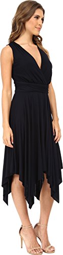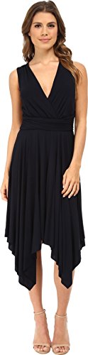 Superbly soft jersey dress flaunts a flattering ruched waist and a flowing handkerchief hem. Deep V-neckline and sleeveless construction. Crossover shoulder straps at back with cutout at center. Pull-on design. 94% rayon, 6% spandex. Dry clean only. Made in the U.S.A. and Imported.