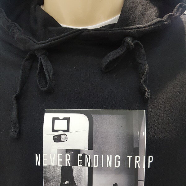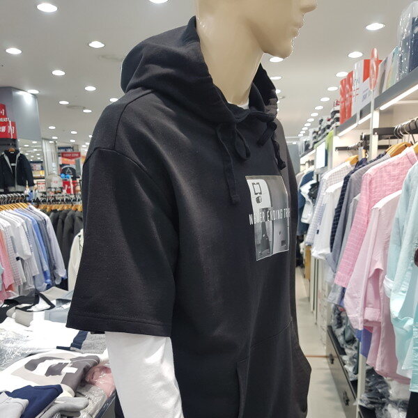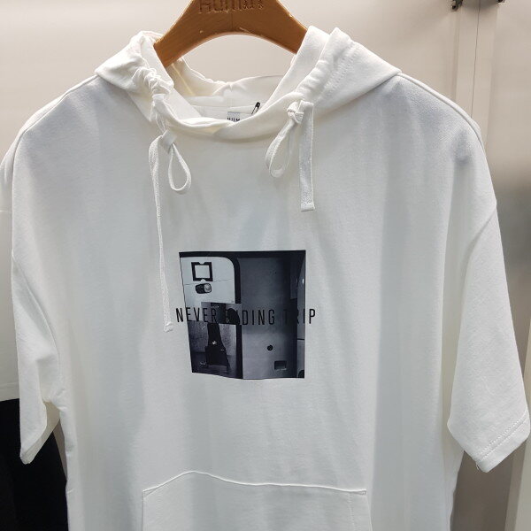 흄 남여공용 반팔후드티셔츠입니다.블랙화이트 칼라로출시되었어요.마네킹은 얇은 긴팔티셔츠 같이 입혔는데 요렇게 입어도 예쁘더라구요~~^^