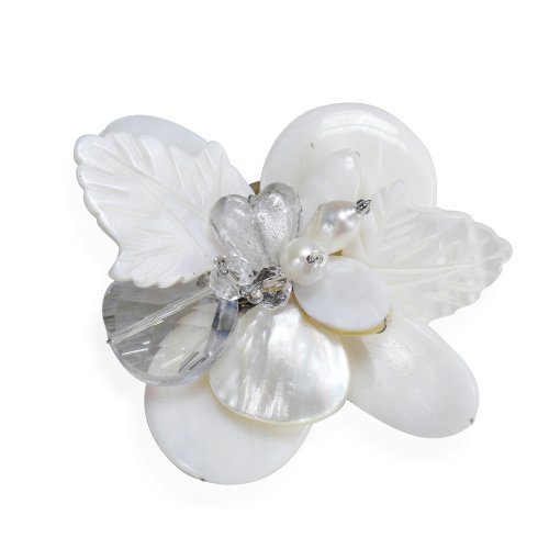-. Feature : Material: Glass, Base metal / Stone: Cultured freshwater pearls, Mother of pearl, Crystal / Flower Measurements: 65 mm (2.56 in) wide x 50 mm (1.97 in) long / Style: Handmade, Pin/Brooch, Floral, Nature | Pearl Grade: C / Color: White | Weight: 29 grams