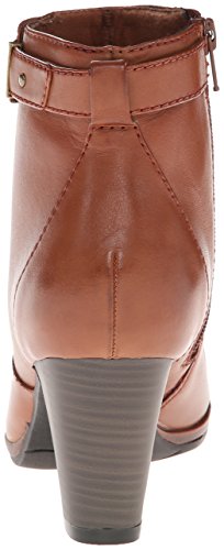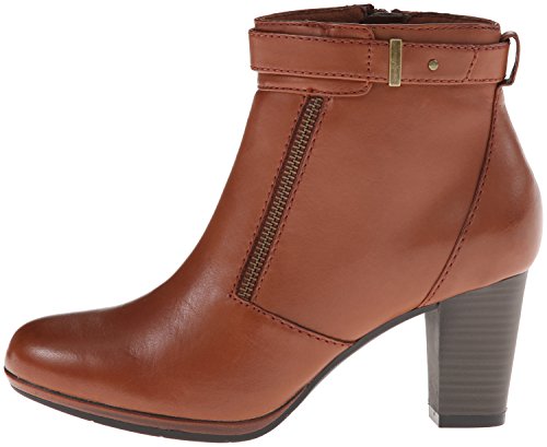 Waxed leather boot with block heel, buckled topline strap, and asymmetric zipper accent