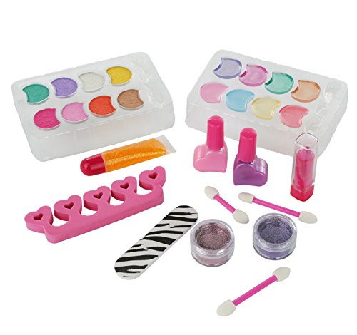 Studio : Pinkleaf Publisher : Pinkleaf Binding : Toy Product Description This isn't your ordinary play beauty kit for girls. Filled with REAL cosmetics non-toxic nail polishes for kids tools accessories, this jumbo beauty kit gift set provides hours hours of pampering fun! Pinkleaf is where you'll find the very BEST gift sets for kids. CABOODLE SET INCLUDES: 8 pot eyeshadow palette, 8 pot lip gloss palette, glitter tube, pink purple nail polish, 2 glitter pots, 1 lipstick, 1 small zebra nail file, 1 heart shaped toe separator, 3 double-sided makeup applicator wands ? EYESHADOWS - Features green, purple, silver, yellow, fuschia, pink, red, brown shimmer eyeshadow powders ? LIP PRODUCTS - 8 matching shades of lip gloss a tube of pretty pink lipstick for kids (super easy to wash off) ? NAIL SUPPLIES - She can use the kid-safe nail polishes, glitter dust, file separator for manicures pedicures ? APPLICATORS - Each makeup caboodle organizer also comes with 3 double-sided cosmetic applicator wands ? PORTABLE: The caboodle kits are outfitted with handles locks, making them easy to carry to sleepovers, parties, play dates ? DURABLE: Made out of extra strong plastic, the caboodle storage case is meant to withstand regular usage by young children ? COLORFUL: We've added a fun kid-friendly design to the exterior of the caboodle for girls. It's girly, fabulous fashionable. Little Girl Beauty Set Makes a Stellar Gift for Toddlers 3 ♡ Give on Christmas, a Birthday, Valentine's Day, Etc. No matter the occasion, the Pinkleaf kid's caboodle with makeup will bring a smile to your sweet girl's face. Give the 27pc caboodle makeup case as a Christmas gift birthday gift or as a party favor for spa parties, makeup parties so much more. Your darling diva will be over the moon when she opens her on the go girl caboodle. Click 'ADD TO CART' to place an order now! 0