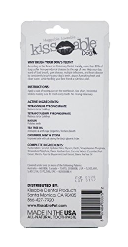 According to the American Veterinary Dental Society, more than 80% of dogs suffer from periodontal diseases by the age of two. Help your dog ward off bad breath, gum disease, multiple infections, and heart disease by consistently brushing your dog's teeth, always furnishing fresh and clean water, while feeding your best friend a nutritious diet. Directions: Apply a dab of toothpaste on the toothbrush. Use short, horizontal strokes making sure to reach every tooth. No rinsing necessary. Ingredients: Water, Sorbitol, Hydrated Silica, Glycerin, Kaolin. Tetra potassium Pyrophosphate, Tetra sodium Pyrophosphate, Xanthan Gum, Cucumbis Sativus (cucumber) Fruit Extract, Mentha Piperita (Peppermint) Leaf Extract, Stevia, Tea Tree Oil.Feature