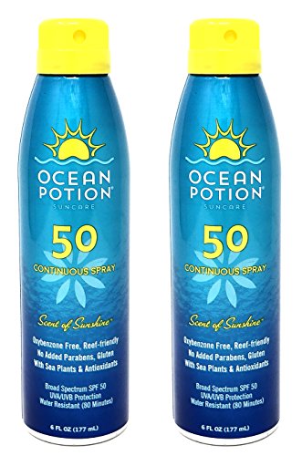 Ocean Potion Anti-Aging Continuous Spray Sunblock SPF 50 6 oz For Quick Coverage Ocean Potion Instant Dry SPF 50 Mist Anti-Aging Sunblock with Parsol 1789 (Avobenzone) provides the highest sunscreen protection without rubbing onto skin. This non-greasy instant drying formula is ideal for all outdoor activities. Provides Broad Spectrum UVA I, II, and UVB protection for xtreme sun exposure. Solaplex enhances the stability of Parsol 1789 (Avobenzone) which makes Ocean Potion sunscreens more reliable and longer lasting. Broad Spectrum Protection with Parsol 1789 Instant Dry Water/Sweat Resistant 360 Continuous Spray Made in the USAFeature