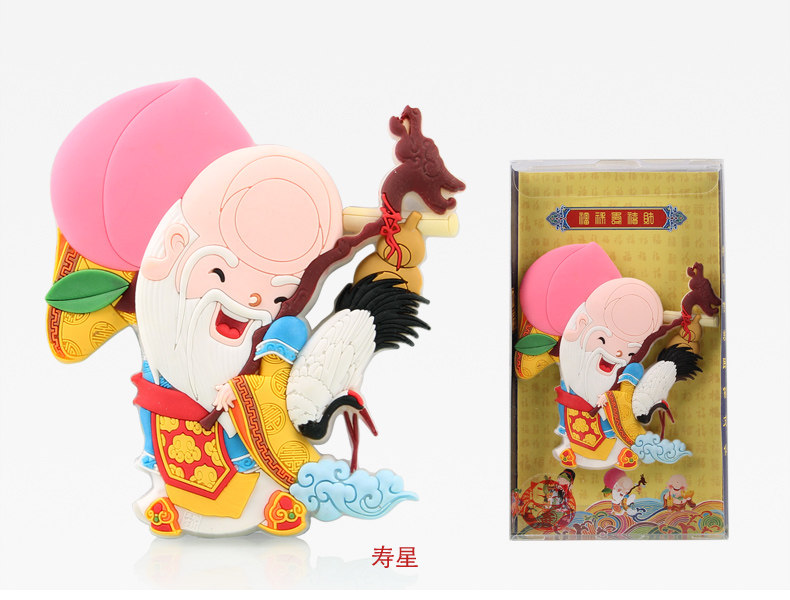 最突出的是头顶大脑门,其身量不高,弯背弓腰,一手持着龙头拐杖,一手托着仙桃,慈眉悦目,笑逐颜开,白须飘逸,长过腰际,人们称之寿星,又叫南极仙人、南极仙翁。