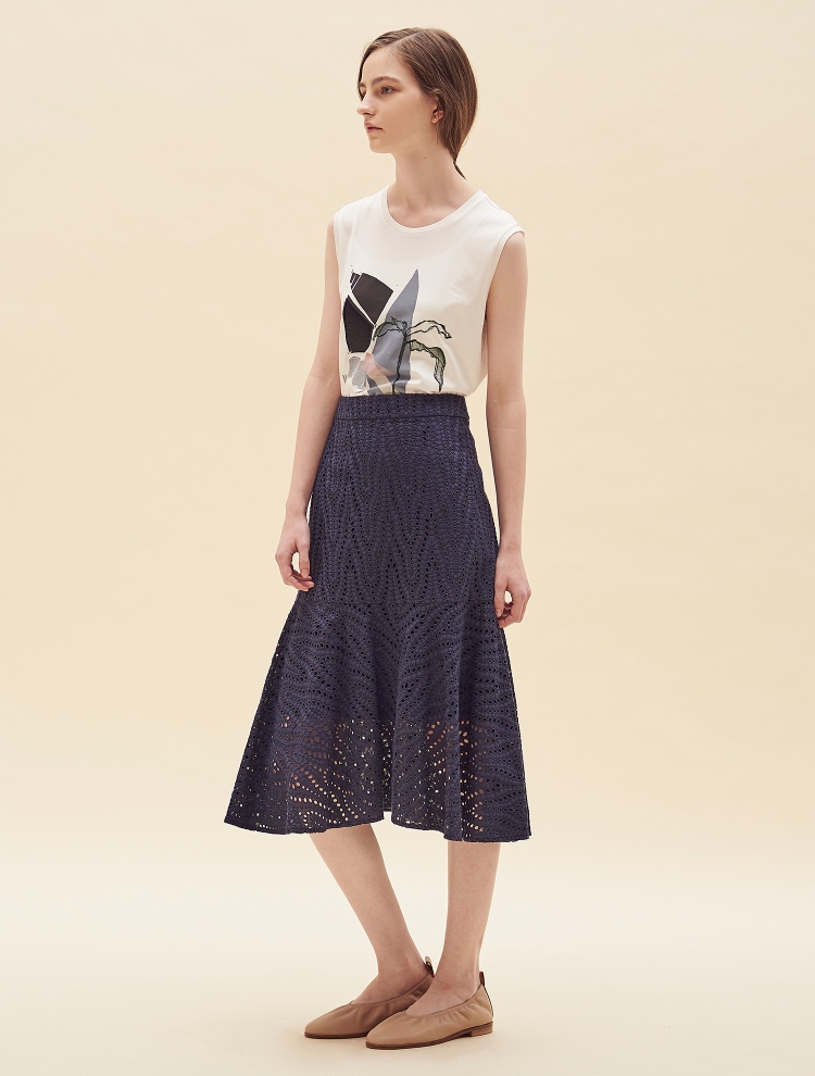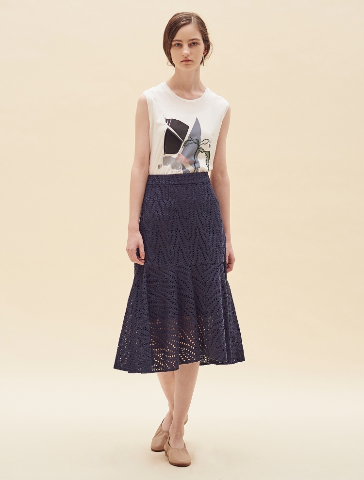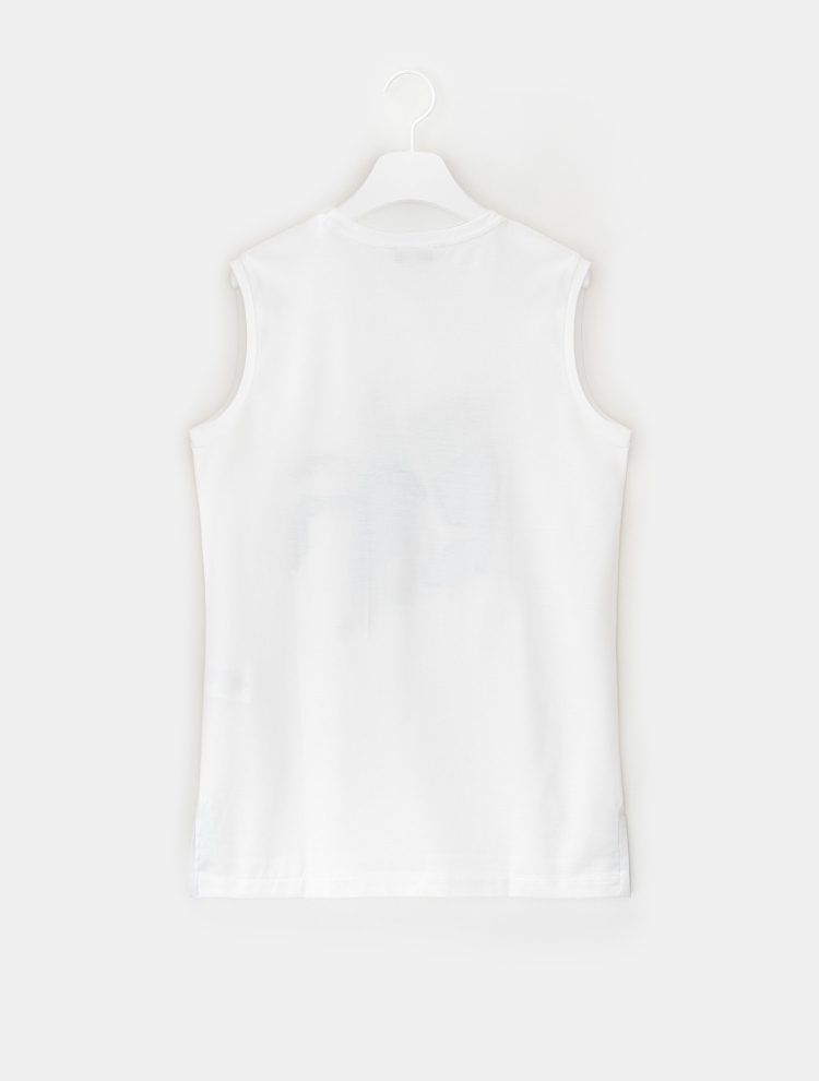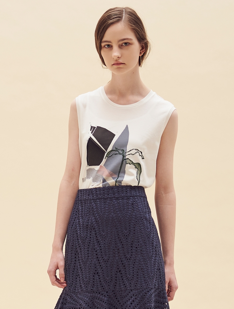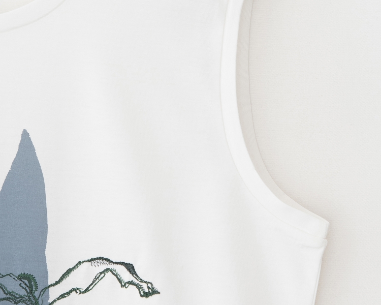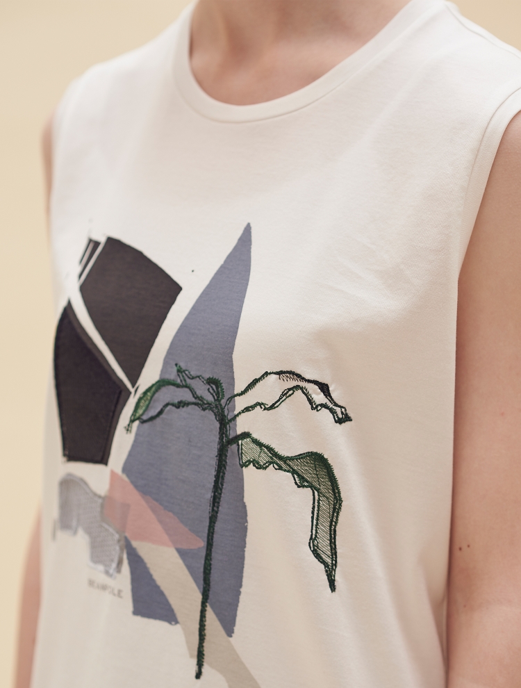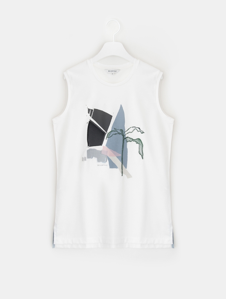 - 전면의 그래픽 프린트와 자수가 매력적인 원포인트 민소매 티셔츠입니다.