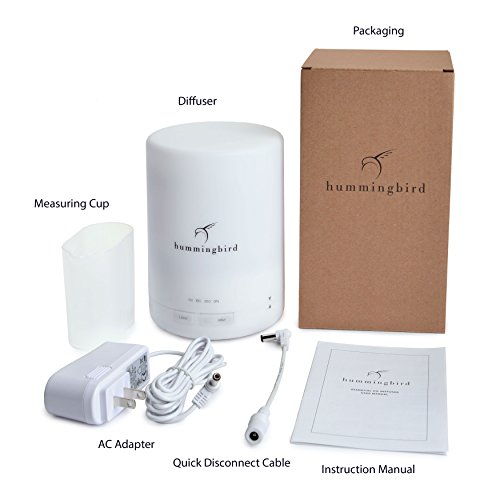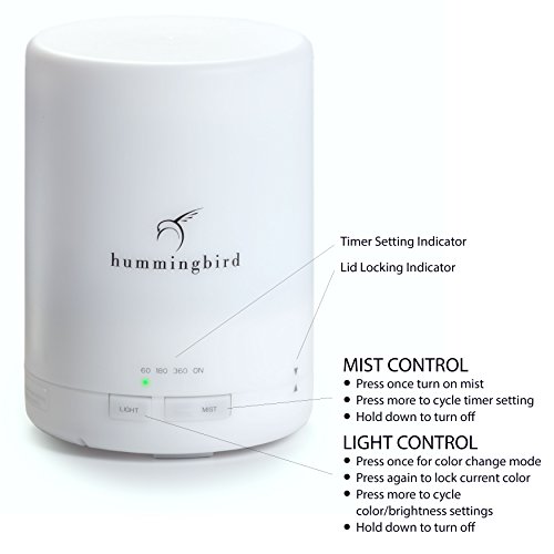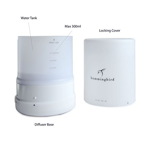 Hummingbird 300ml Essential Oil Diffuser, 8 Hours Cool Mist, 7 Color LED, 4 Timer Settings, FREE Quick Disconnect Cable, Locking Lid, Ultrasonic Technology w/ Auto Shutoff