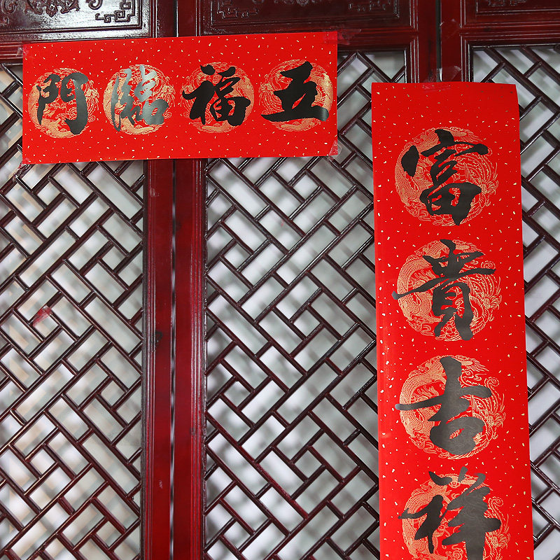 3 meters black body calligraphy couplets (auspicious wishful everything goes well-being of peace blessing come five blessings)