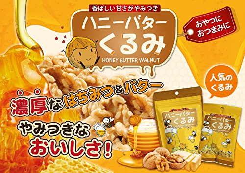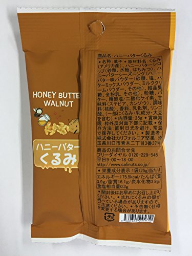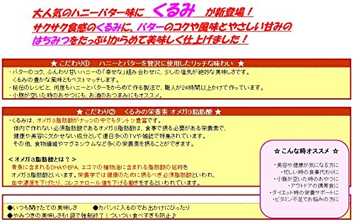 原材料:くるみ(アメリカ産)、ハニーバターシロップ(砂糖、水飴、はちみつ)、ハニーバターシーズニング(ハニーバター味パウダー(砂糖、塩、バターミックスパウダー、ミルククリームパウダー、その他)、結晶果糖、全粉乳、その他)、粉糖、バター、精製塩/二酸化ケイ素、甘味料(ステビア、カンゾウ)、調味料(核酸)、香料、乳化剤、リンゴ酸、(一部に乳成分・くるみ・大豆を含む)