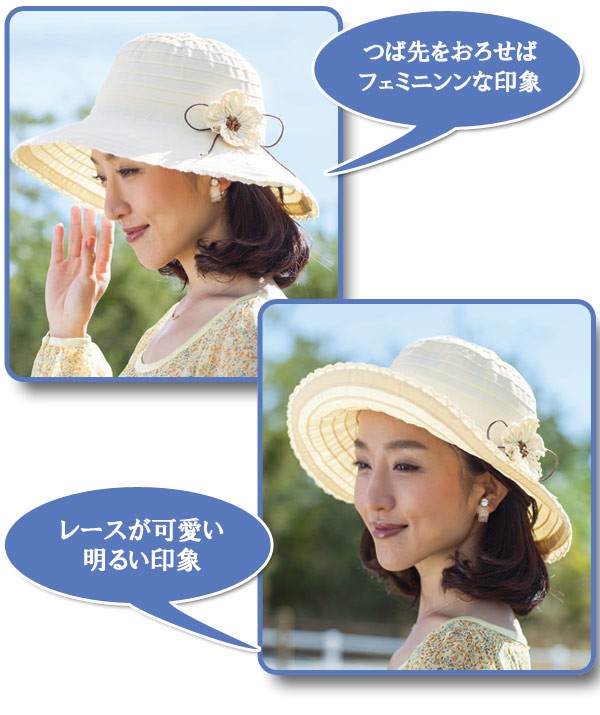 | つば先コットンレースのたためるブレードハット。軽くて洗えるブレード素材。つば先にはソフトワイヤー入りでアレンジ自由自在。丸めて持ち運びに便利。内側のゴムでサイズ調整可能。取り外しできるお花のデザインのコサージュ付き。 |