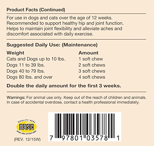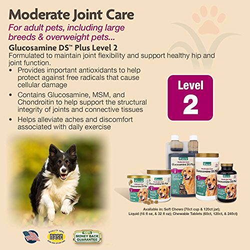 NaturVet Glucosamine DS Level 2 Moderate Joint Care Formulated to Supply Important Joint Support Needs for Adult Pets, Including Large Breeds and Overweight Pets. Provides Important Antioxidants and Helps to Support the Structural Integrity of Joints and Connective Tissue. Helps Alleviate Aches and Discomfort Associated with Daily Exercise. Wheat Free, Tasty Soft Chews 120ct for Dogs and Cats Over the Age of 12 Weeks. Recommended to Double the Suggested Daily Amount for the First 3 Weeks. Active Ingredients per 2 Soft Chews: Glucosamine, Methylsulfonylmethane, Yucca Schidigera, Chondroitin Sulfate, Calcium Ascorbate (Vitamin C), DL-alpha-tocopheryl acetate (Vitamin E), Omega-3 Fatty Acid and Omega-6 Fatty Acid. All NaturVet Products are Veterinarian Formulated and Manufactured in the USA in an FDA Audited, cGMP Compliant Facility with a 100% Satisfaction Guarantee.Feature