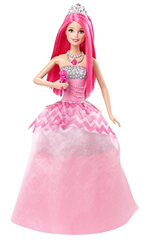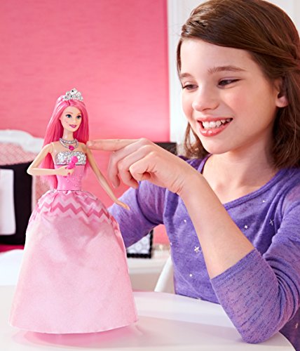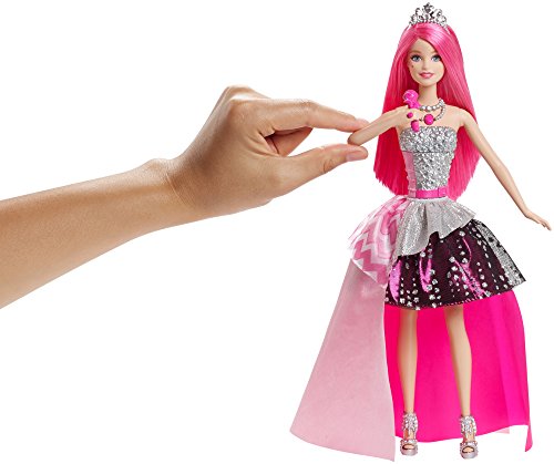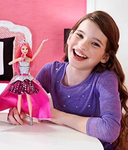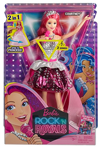 In Barbie in Rock 'N Royals, two very different worlds collide when a mix-up sends a princess and a pop star to the wrong camps. As they face an epic sing-off, both girls embrace their differences, find their true voices and learn that anything is possible when they work together! Girls will love celebrating the story with this singing Courtney doll, who magically transforms from royal to rocker. Simply lift the pink microphone to her mouth to activate a dramatic fashion transformation and play two songs clips from the film! Courtney doll's skirt twists around, changing her into a trendy pop star while the songs play. As a princess, she wears a pink ball gown with a studded silver and pink bodice and trendy chevron-print peplum. As a pop star, she shines in a studded silver bodice and high-low skirt with black and pink graphic print, silver peplum and sparkly pink skirt. A silvery tiara and matching shoes are show-stopping accessories. Girls will love transforming Courtney doll from princess to pop star and back again as their stories transform, too! Collect her co-stars for a full band and even more possibilities for play (sold separately)! Includes Courtney doll with transforming and musical features, shoes, tiara and microphone (non-removable). Doll cannot stand alone.Feature