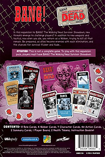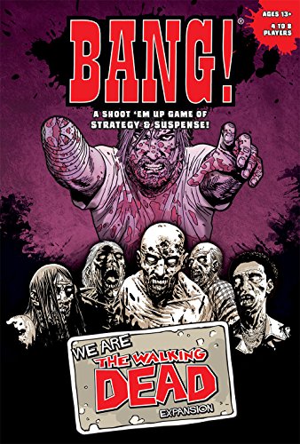 -. Binding : Toy -. Brand : USAopoly -. EAN : 0700304046604 -. Feature : Expansion to BANG! The Walking Dead includes additional player board for an 8 player game / 7 New Character Cards / 40 New Action Cards -. IsAdultProduct : 0 -. ItemPartNumber : BN095-393 -. Label : USAOPOLY, Inc. -. Manufacturer : USAOPOLY, Inc. -. Model : BN095-393 -. MPN : BN095-393 -. PackageQuantity : 1 -. PartNumber : BN095-393 -. ProductGroup : Toy -. ProductTypeName : TOYS_AND_GAMES -. Publisher : USAOPOLY, Inc. -. Studio : USAOPOLY, Inc. -. Title : Bang! We Are The Walking Dead Expansion Card Game -. UPC : 700304046604 -. Warranty : No Warranty