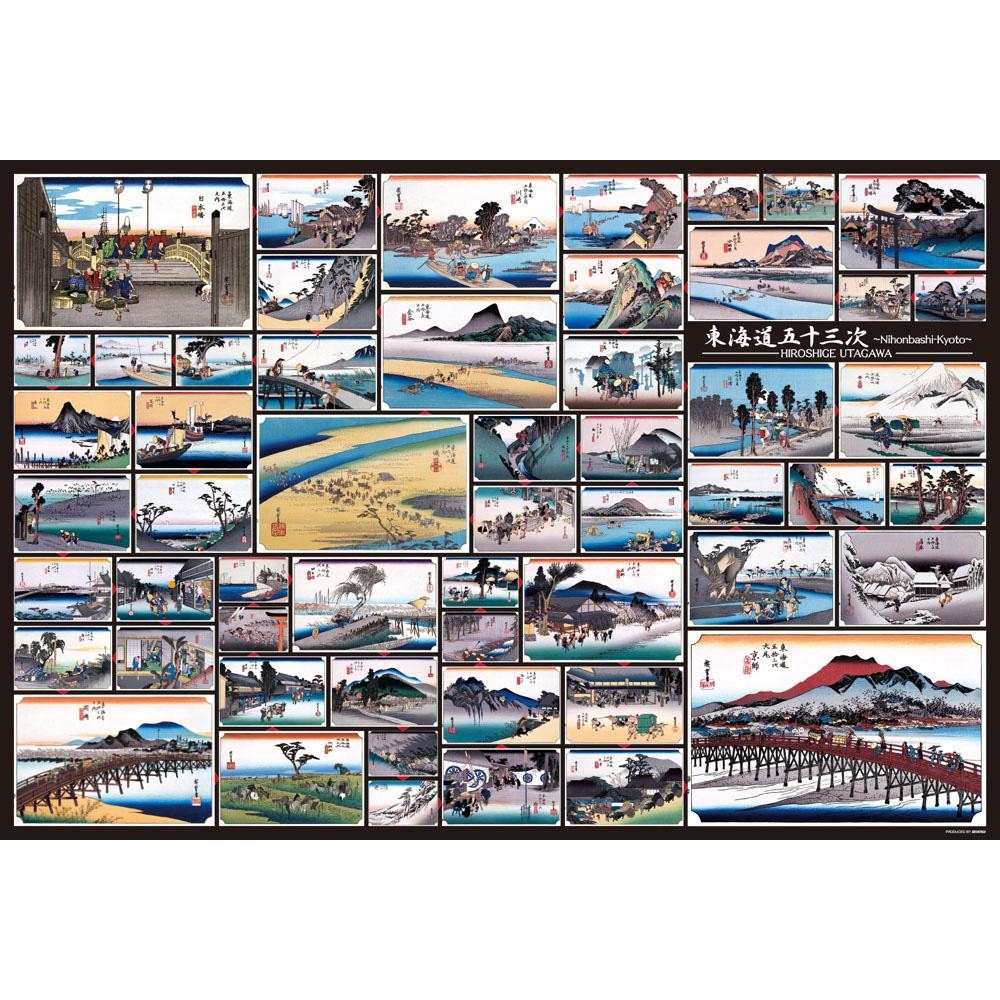 | 歌川広重の作品「東海道五十三次」総数55図を一枚に集めたコレクションアートのジグソーパズルです。パッケージ裏面には、各図のタイトル(地名)と各宿場位置の地図が印刷されており、完成後もさらに楽しめます。 |