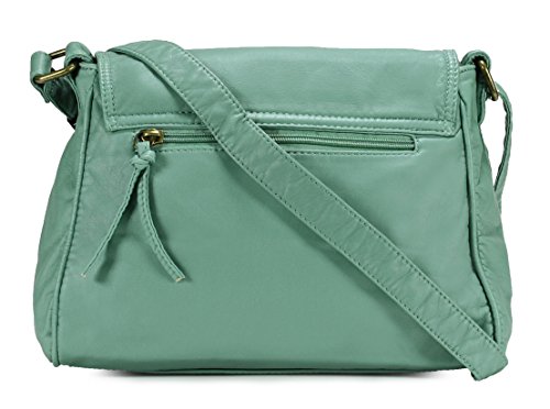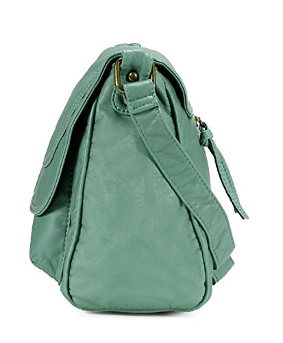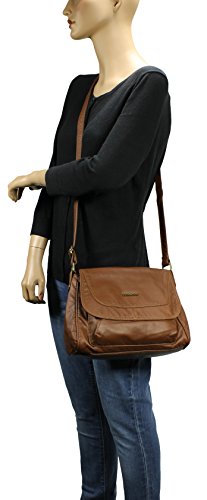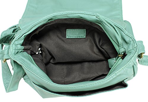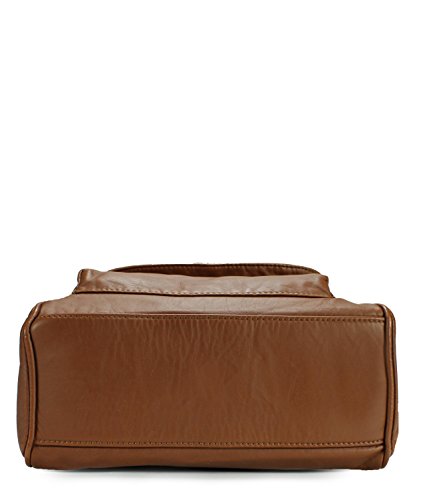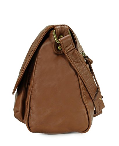 -. Feature : Ultra soft synthetic washed vegan leather with fabric lining. / Elegant bronze-toned hardware. Top flap closure. / Interior cell phone pocket, multifunctional slip and side zipper pocket. / Adjustable shoulder strap drops 24". / Size: 10.2"x7.5"x3.6"