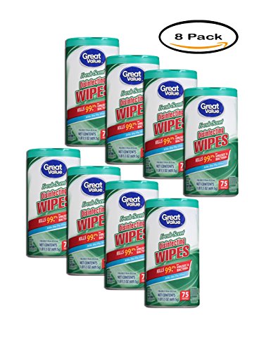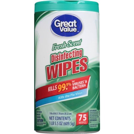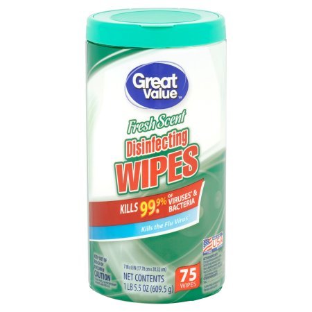 -. Brand : Great Value -. EAN : 0672823770554 -. Feature : Bleach free / Kills Pandemic 2009 H1N1 influenza A virus / Kills the flu virus -. LegalDisclaimer : Actual product packaging and materials may contain more and different information that what is shown on our website. we recommend that you do not rely solely on the information presented that you always read labels, warnings and direction before using and consuming a product. -. ProductGroup : Kitchen -. ProductTypeName : KITCHEN -. Title : PACK OF 8 - Great Value Disinfecting Wipes, Fresh, 75 Wipes -. UPC : 672823770554