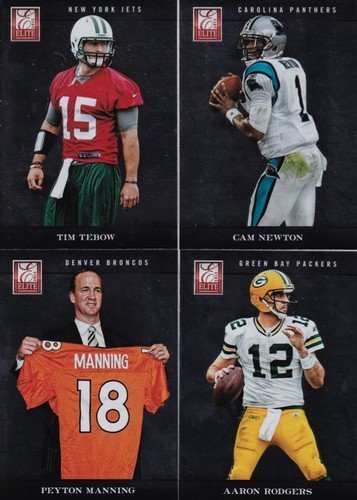 This is the 2012 Donruss Elite Football series complete mint 100 card basic hand collated set; it was never issued in factory form. Loaded with stars including Cam Newton, Michael Vick, Aaron Rodgers, Sam Bradford, Tim Tebow, Adrian Peterson, Tony Romo, Ben Roethlisberger, Peyton Manning (Broncos), Tom Brady, Philip Rivers, Eli Manning, Drew Brees, Carson Palmer, Mark Sanchez, Matt Ryan, Joe Flacco, Rob Gronkowski and many others!