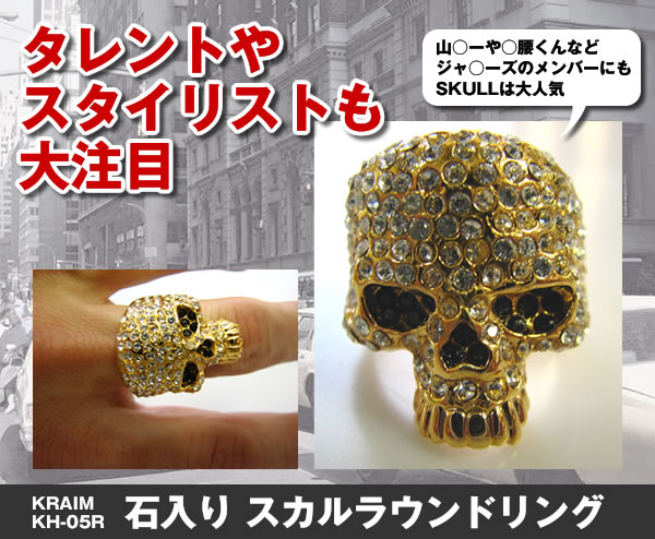 雑誌やテレビをみていると、スカルリングをしているタレントさんをよくみかけます。ジャ○ーズのメンバーにも人気!一見、ハードに見えますが、けっこう誰にでも馴染んでかっこいいんです!今年のトレンドを取り入れて、女の子の視線を集めて! サイズ/17号、19号、21号約縦2.7×リング幅0.6cm ※サプライヤー直送品 ご注文後、当日~1営業日後の出荷となります【商品名】KRAIM 石入りスカルラウンドリング(KH-05R)19号