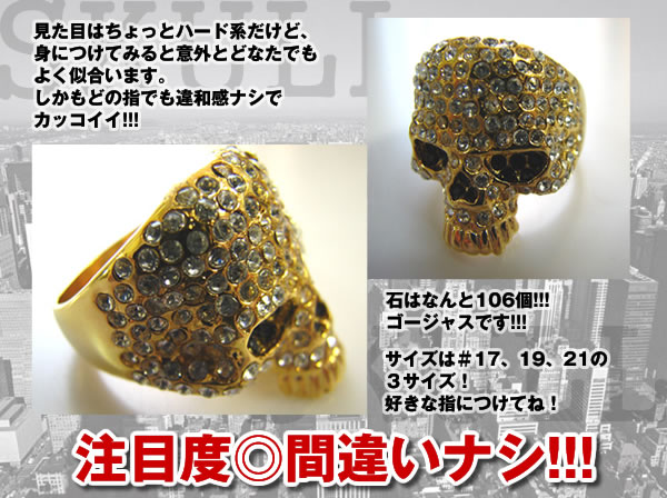 雑誌やテレビをみていると、スカルリングをしているタレントさんをよくみかけます。ジャ○ーズのメンバーにも人気!一見、ハードに見えますが、けっこう誰にでも馴染んでかっこいいんです!今年のトレンドを取り入れて、女の子の視線を集めて!