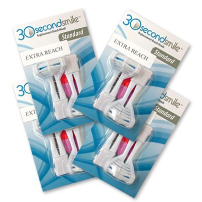 -. Feature : Our unique double- sided brush head cleaning function; brushes inside, outside and, chewing surface, plus hard to reach areas. / Only 30 seconds needed, your teeth will be whiter and know you have fresher breath. / Bristles are angled at the recommended 45 degree, to provide ultra cleaning. / Reduces tooth plaque, coffee/tea stains; increase healthy gums and sparkling clean teeth. / Package Includes: 4 Sets of 30 Second Smile Extra Reach Standard Soft Brush Heads