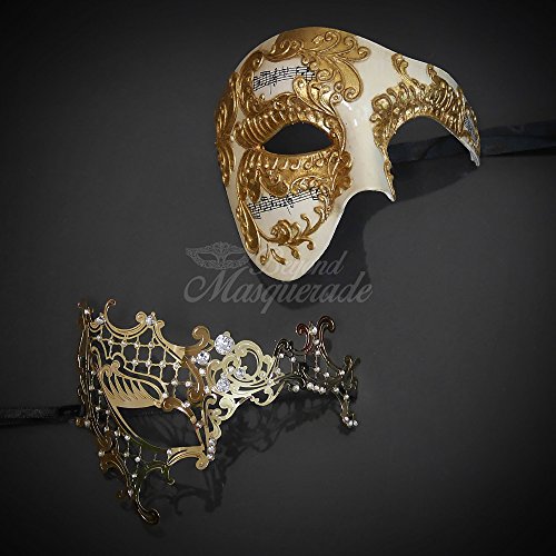 -. Binding : Misc. -. Brand : MasqueradeParty -. Color : Gold -. EAN : 0609015812624 -. Feature : Laser Cut Masquerade Mask / Size: One Size fit Most / Materials: Made of Paper Mache for His and Light Metal for Hers / Perfect for Masquerade, Mardi Gras, Wedding, Prom, and Costume Party! -. ProductGroup : Beauty -. ProductTypeName : BEAUTY -. Size : One Size -. Title : His and Her Gold Phantom of the Opera Themed Masquerade Mask -. UPC : 609015812624