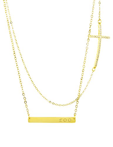 -. Title : Personalized Layered Long Choker Necklace, Name Bar Plate with CZ Pave Cross Sideway, Birthday Gift