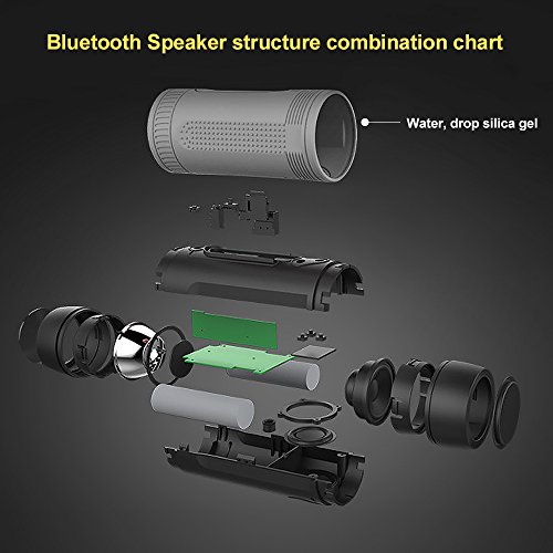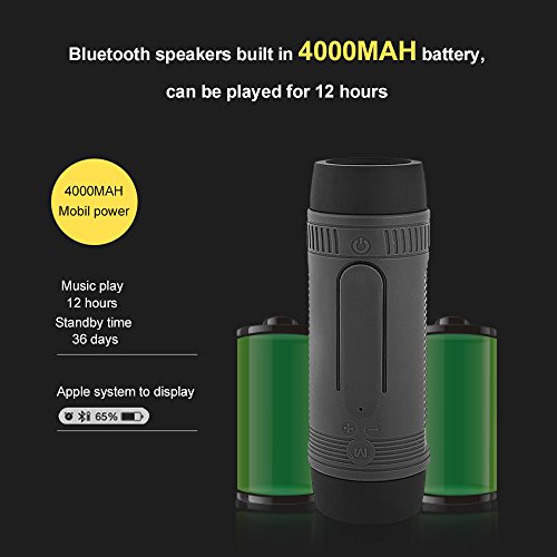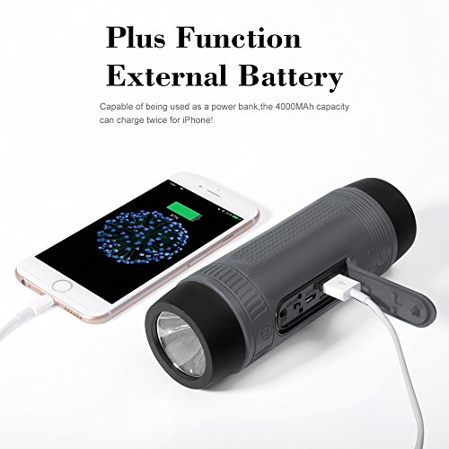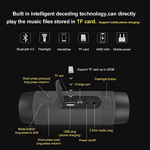 This is a multifunctional bluetooth speaker which has 3-modes of flashlight function for emergency; Support TF card up to 32GB, FM, wireless bluetooth music, power bank functions to make your travel more convenient;