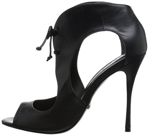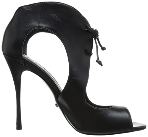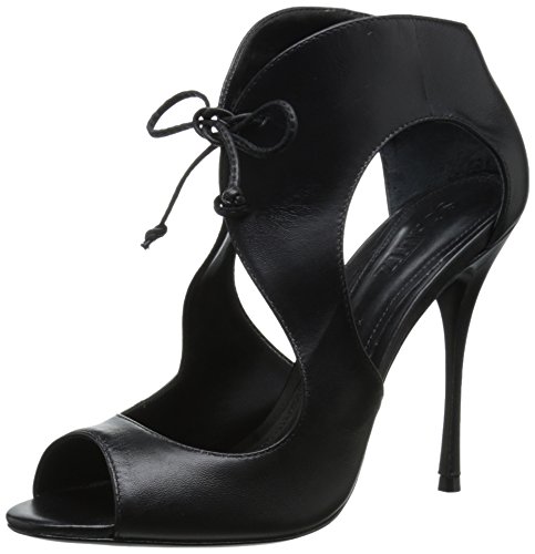 Peep-toe dress sandal featuring leather upper with dramatic cutouts and slender tie closure