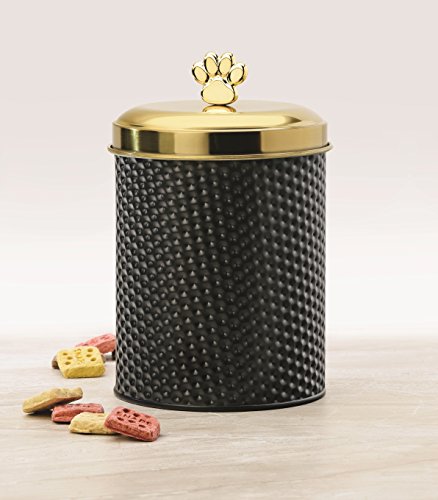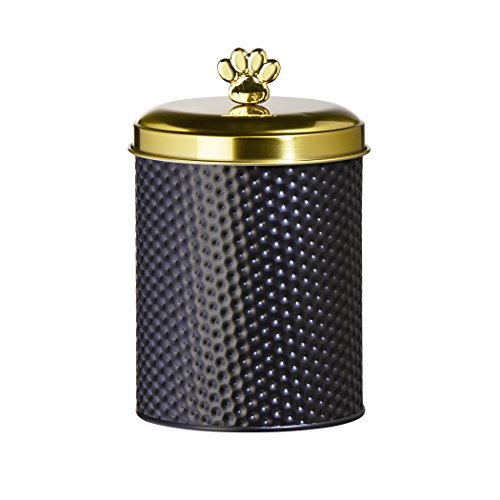 - This food safe metal storage Canister features a matte black finish along with a hammered texture and a gold lid with a Paw shaped knob
