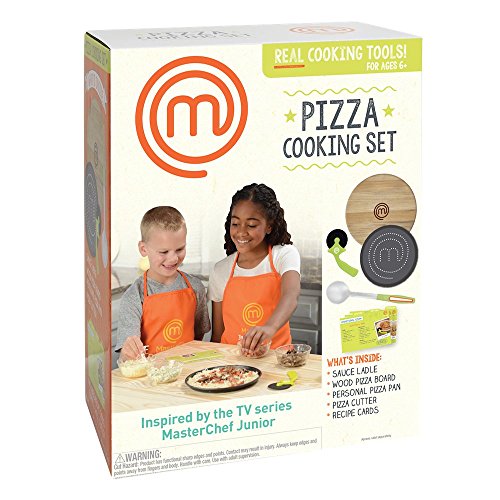 MasterChef Junior Pizza Cooking Set - Recreate the fun and excitement of the hit TV series MasterChef Junior at home. The new MasterChef Junior cooking sets include real cooking tools with kid-safe, non-slip silicone grips. Each set features three unique recipe cards for all levels of experience: line cook, sous chef and master chef, plus one blank recipe card to write your own recipe. The Pizza Cooking Set includes a sauce ladle, wood pizza board, personal pizza pan and plastic pizza cutter. Apron not included. Collect all five sets and become the ultimate MasterChef Junior. Which challenge will you take on first? Recipes included: Traditional pizza, breakfast pizza and gourmet flatbread. Ages 6 and up / Food not included