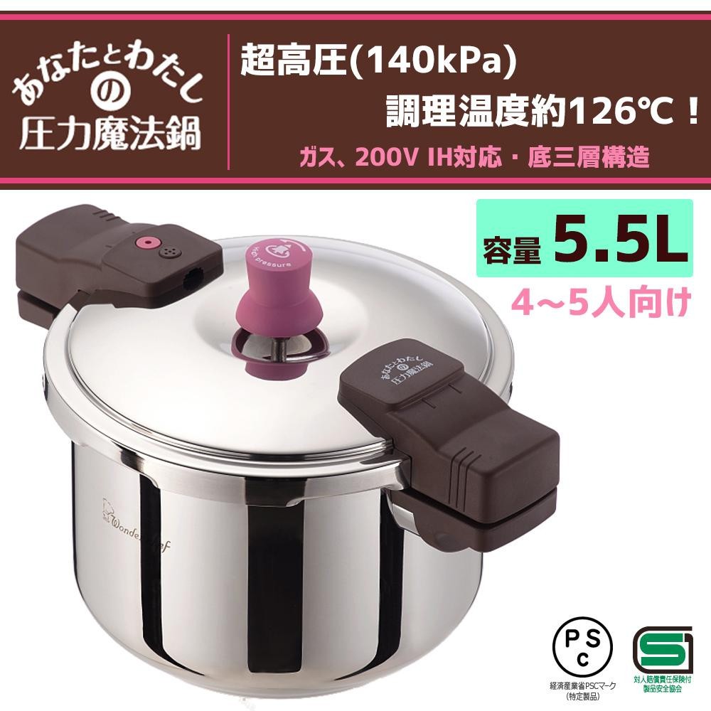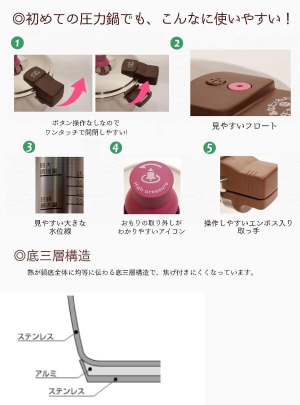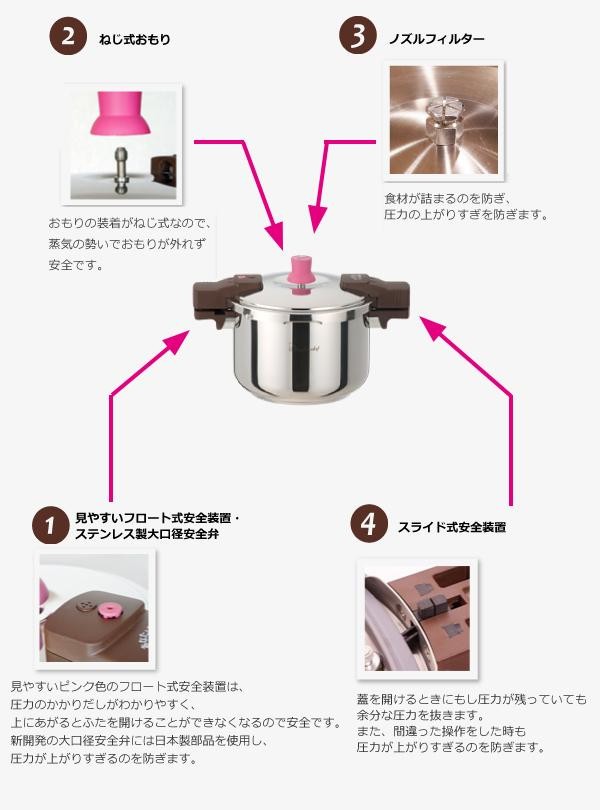 | 仕様 | 作動圧:140kPa(2.38気圧) 調理温度:約126度 対応熱源:ガス火、IH(電磁調理器)200V 水の容量:最高水位線/約3.6L、豆類線/約1.8L 白米最大炊量:約6合 大豆最大煮量:約450g 食洗機:使用不可 底三層構造 |