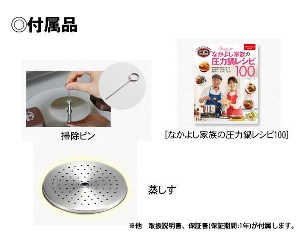 | 付属品 | 「なかよし家族の圧力鍋レシピ100」本 蒸しす 掃除ピン 取扱説明書 保証書(保証期間:1年) |
