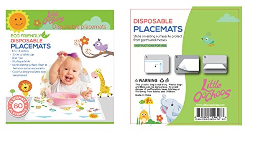 -. Binding : Baby Product -. Brand : Little Oochoos -. EAN : 0645905416183 -. Feature : GERM FREE SURFACE FOR EATING - Our disposable placemats ensures the eating surface it clean from germs when eating out such as in restaurants or food courts. / SAFETY GUARANTEED BPA FREE PHTHALATE FREE LATEX FREE PRE STERILIZED - We ensure that safety for your baby is at our utmost concern when designing these disposable kids placemats. / IMPROVED EXTRA STICKY FOUR SIDED STICKY STRIPS - We strive to ensure that your place mat stays put on any table surface. This means less mess to clean up. / 20% MORE PLACEMATS FOR TABLE TOPS - We give you 60 place mats for the P.R.Ice of 50 place mats. You get 20% more than our competitors for you and your child's needs. / DESIGNED BY PARENTS FOR PARENTS WITH FUN ANIMAL DESIGN - At Little Oochoos we are parents too. We love our babies and know just how much it means to give your child the best love and care they deserve. That's why we designed this placemats with a fun animal design so that your child is kept entertained while enjoying their meal. -. IsAdultProduct : 0 -. Label : Smart Creations Pro -. Manufacturer : Smart Creations Pro -. MPN : DisposablePlacemats60 -. PackageQuantity : 60 -. PartNumber : DisposablePlacemats60 -. ProductGroup : Baby Product -. ProductTypeName : BABY_PRODUCT -. Publisher : Smart Creations Pro -. Studio : Smart Creations Pro -. Title : Safari Disposable Placemats for Table Top 60 Mats for Children Kids Toddlers Baby perfect to use as Restaurants Place mats BPA Free Eco Friendly Sticks to Table Avoid Germs Fun Designs Keep Neat Now! -. UPC : 645905416183
